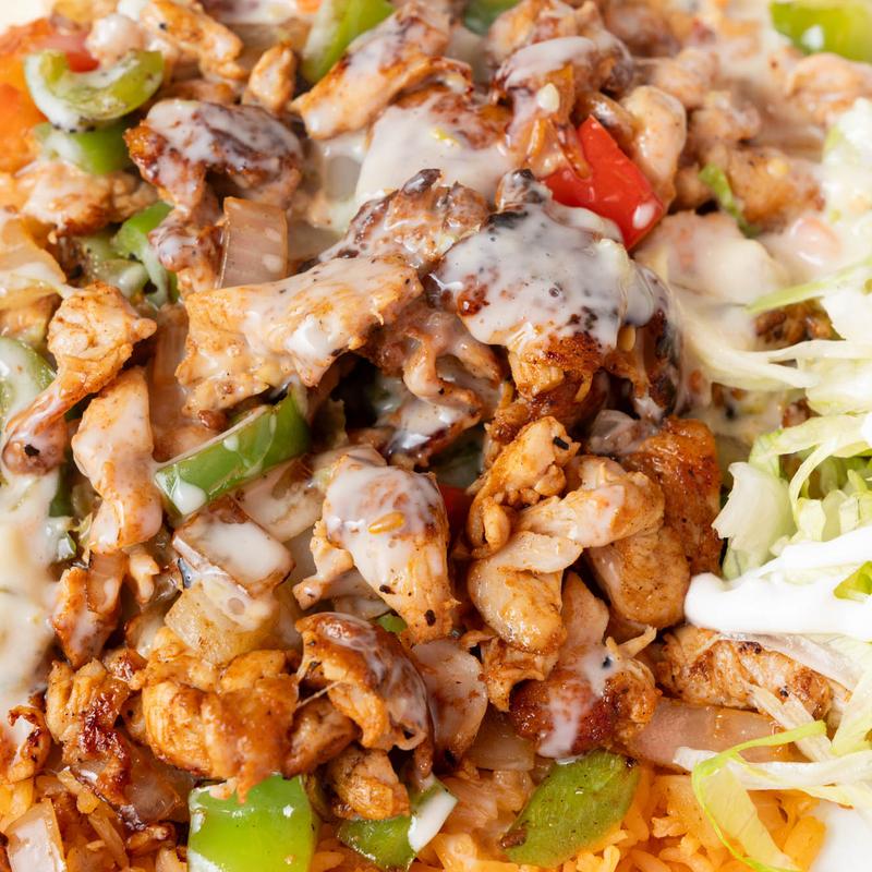 Rice mixed with chicken, onions, and bell peppers. Served with sour cream, lettuce, and tomatoes.