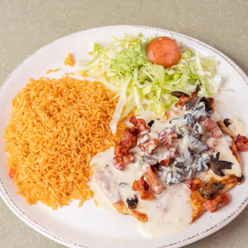 steak or chicken whit onion, bell pepper. served w/beans & top w/lettuce ,guacamole sour cream tomatoes and shredded cheese