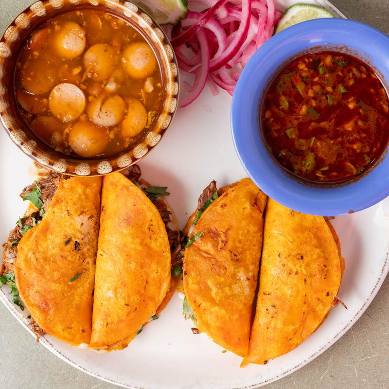 Ten tacos with your choice of beef or chicken. Served with rice and beans on the side.