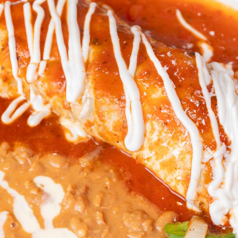 Five enchiladas with your choice of beef or chicken. Served with rice, beans, sour cream, lettuce, and tomatoes on the side.